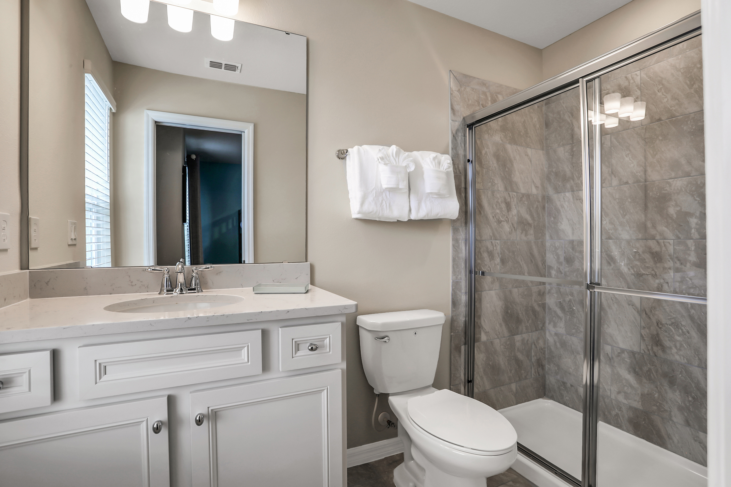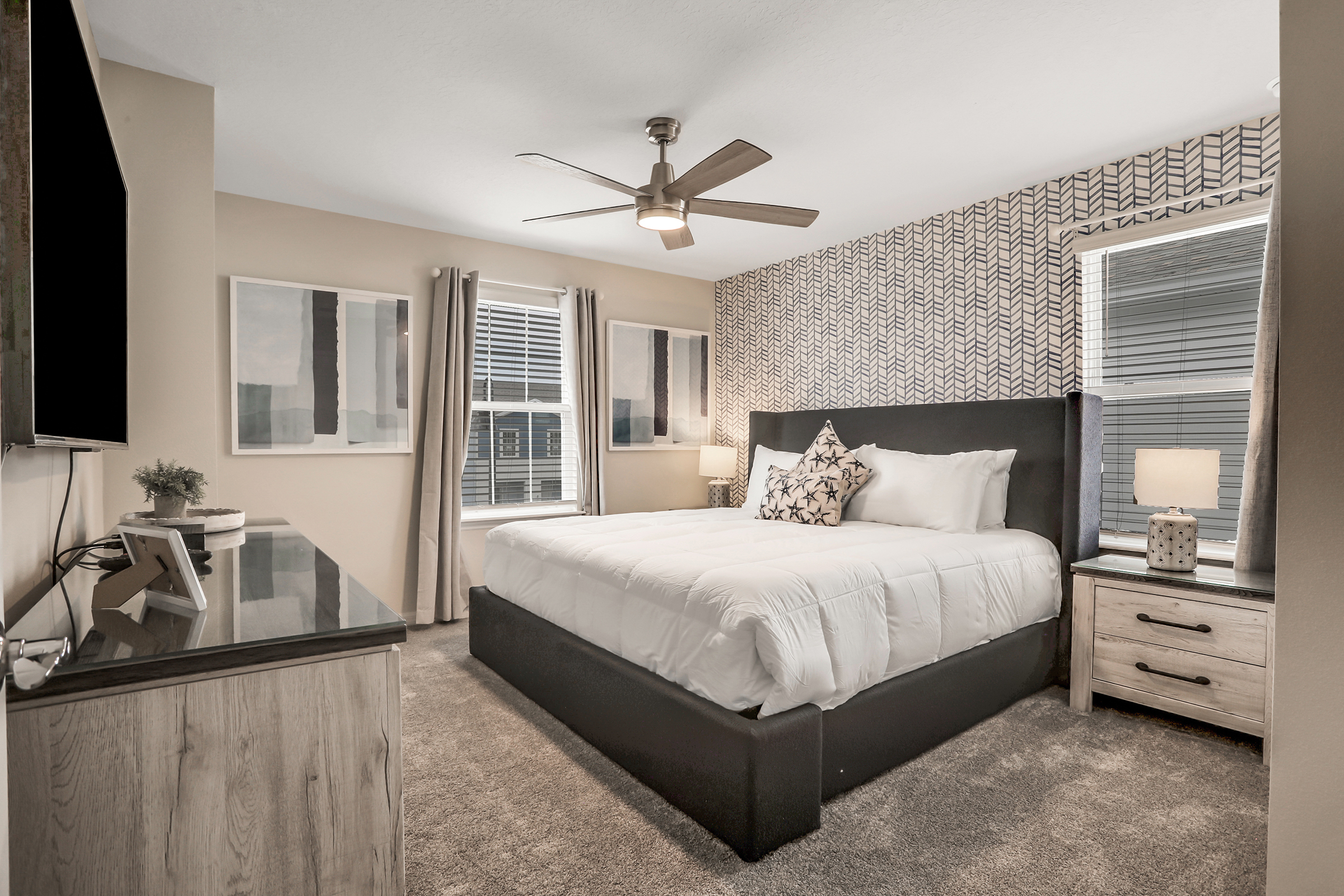 Perfect for families and groups up to 14, this spacious villa features 3 custom-themed kids’ bedrooms, 3 master suites (two with en-suite baths), and a private screened-in pool and spa with no rear neighbors for total privacy.